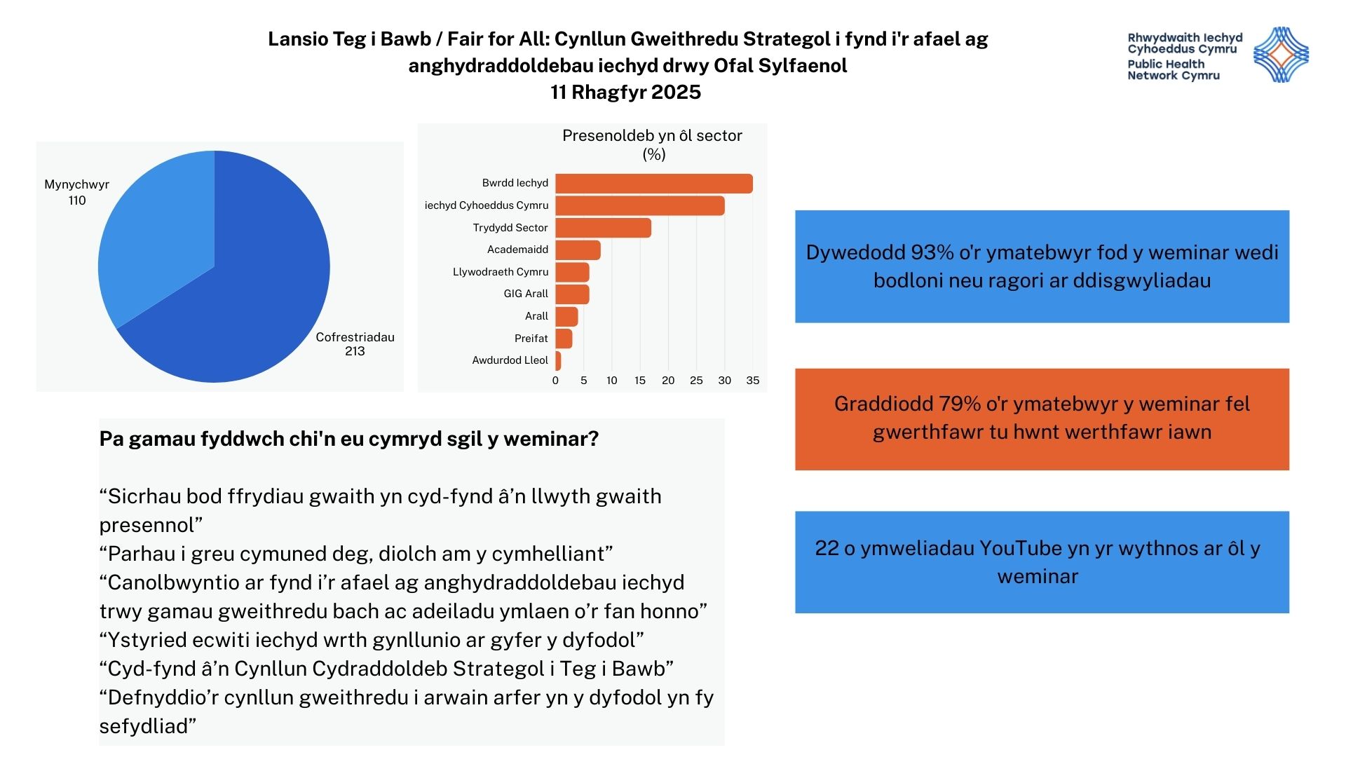 Mae’r weminar hon yn lansio cynllun gweithredu Gofal Sylfaenol Tecach – Teg i Bawb, Fair for All yn ogystal â datblygu drwy adolygu’r dystiolaeth, y data a rowndiau ailadroddus o weithdai wyneb yn wyneb ac ar-lein. Mae’n bwriadu ymgysylltu a chydweithio helaeth â chleifion, gweithwyr gofal iechyd proffesiynol, uwch arweinwyr, grwpiau cymunedol, ac arbenigwyr trwy brofiad ar draws y system Gofal Sylfaenol yng Nghymru.